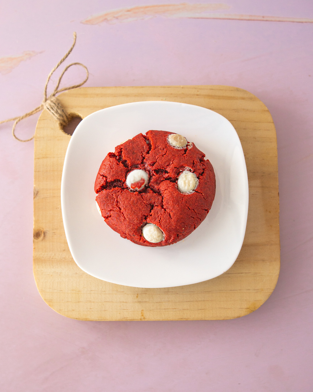 Galleta de red velvet con chips de chocolate blanco y un cremoso corazón de ganache blanco. Delicadeza en cada bocado