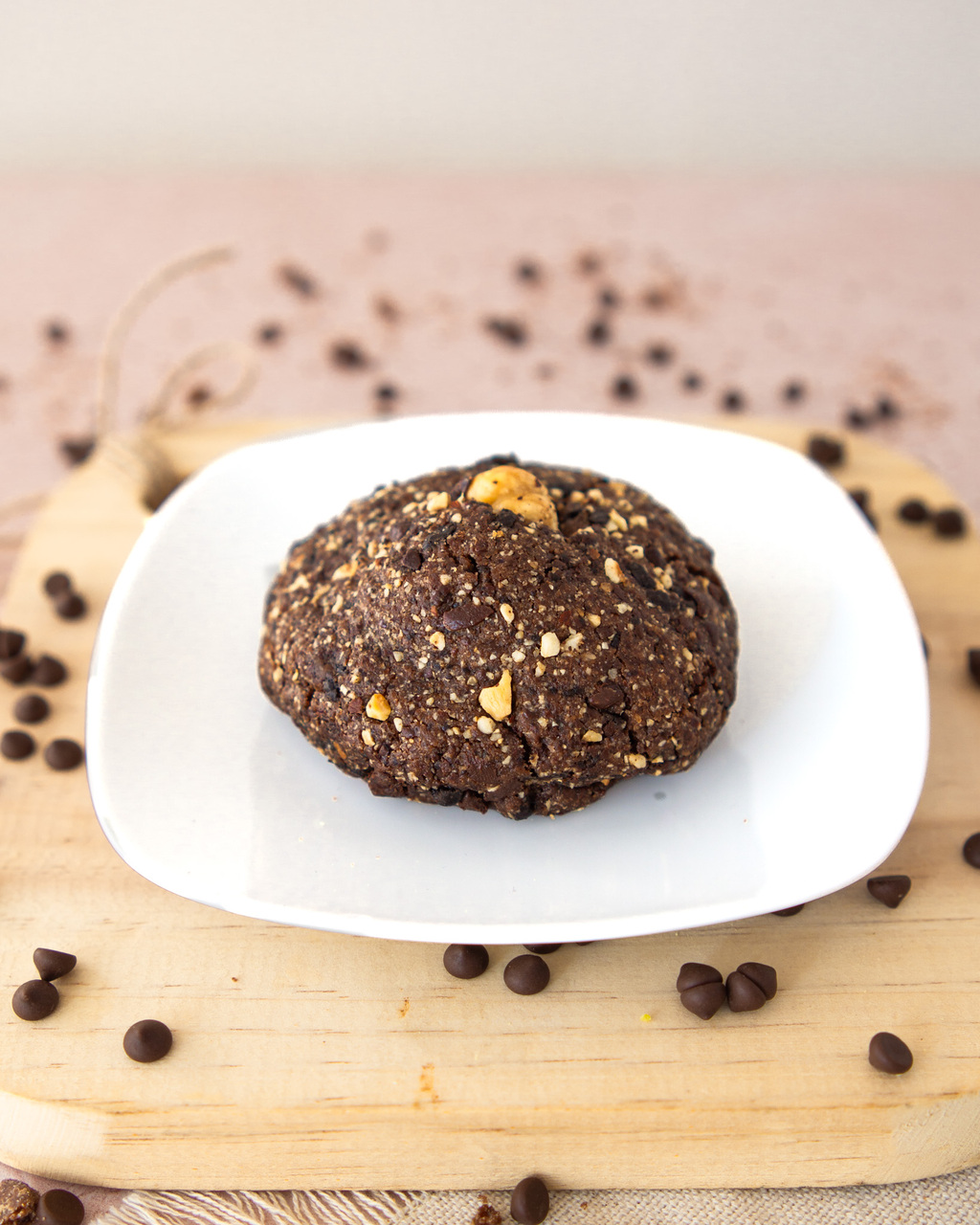 Galleta de chocolate con trozos de avellana y nueces, y un cremoso corazón de ganache de avellana. Pura entrega en cada bocado